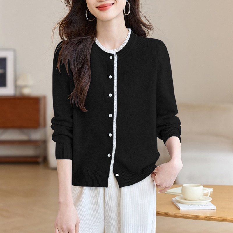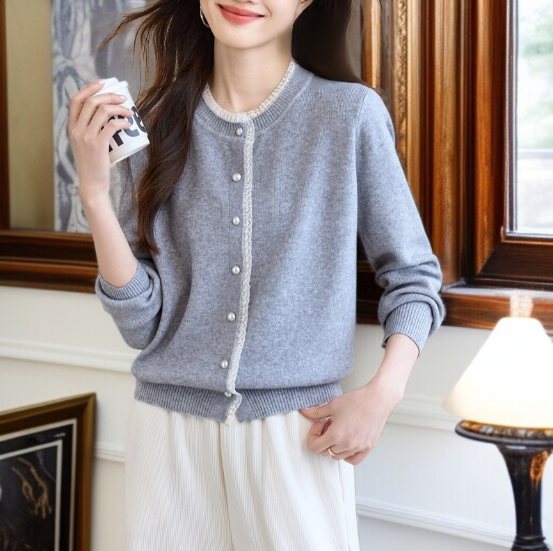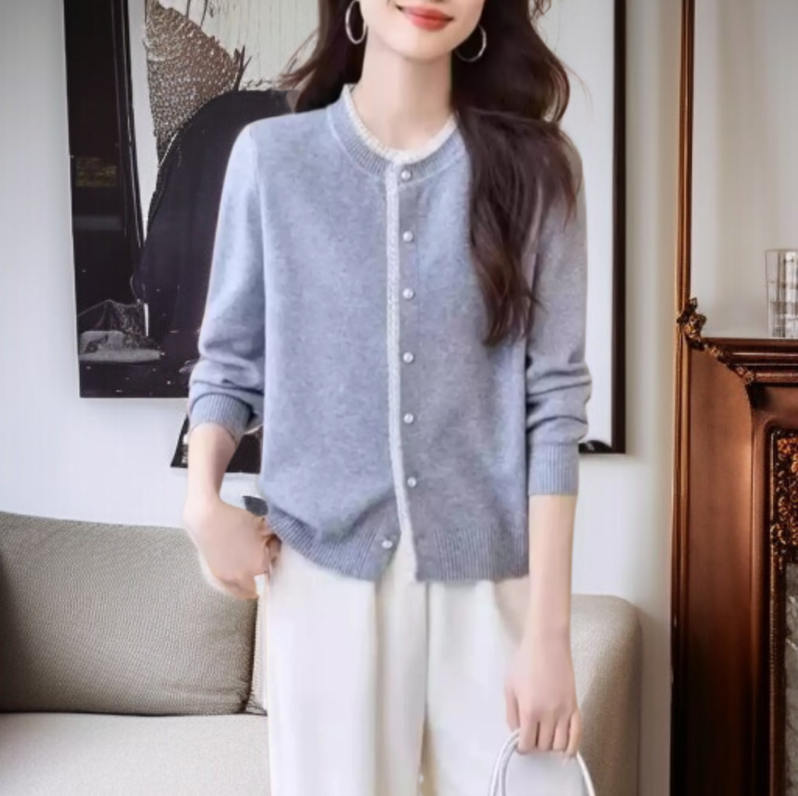 여성 그레이 니트 가디건 아우터 무드 상의 레이스 긴팔 니트